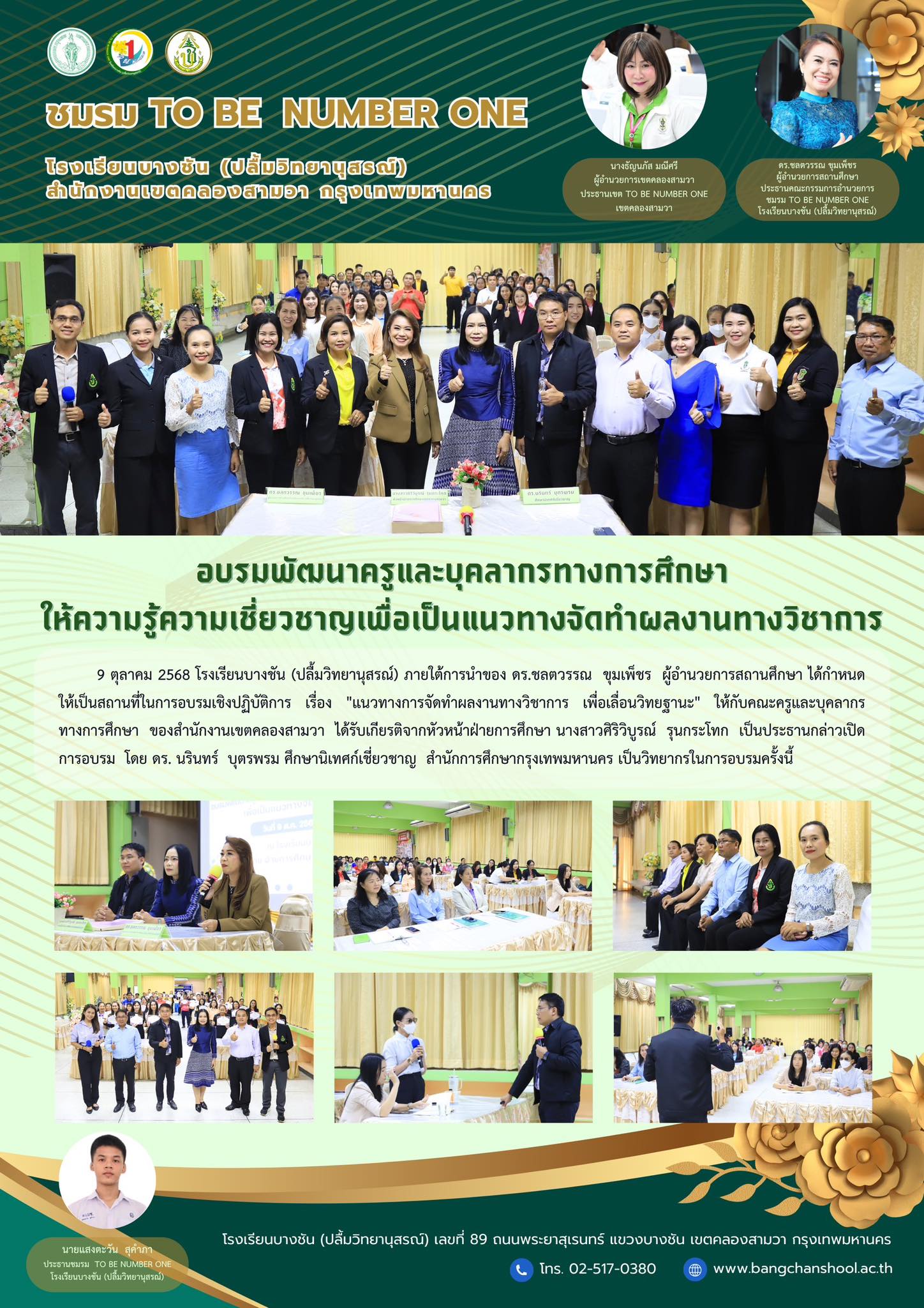9 ตุลาคม 2568 โรงเรียนบางชัน (ปลื้มวิทยานุสรณ์) ภายใต้การนำของ ดร.ชลตวรรณ ขุมเพ็ชร ผู้อำนวยการสถานศึกษา ได้กำหนดให้เป็นสถานที่ในการอบรมเชิงปฏิบัติการ เรื่อง "แนวทางการจัดทำผลงานทางวิชาการ เพื่อเลื่อนวิทยฐานะ" ให้กับคณะครูและบุคลากรทางการศึกษา ของสำนักงานเขตคลองสามวา ได้รับเกียรติจากหัวหน้าฝ่ายการศึก...