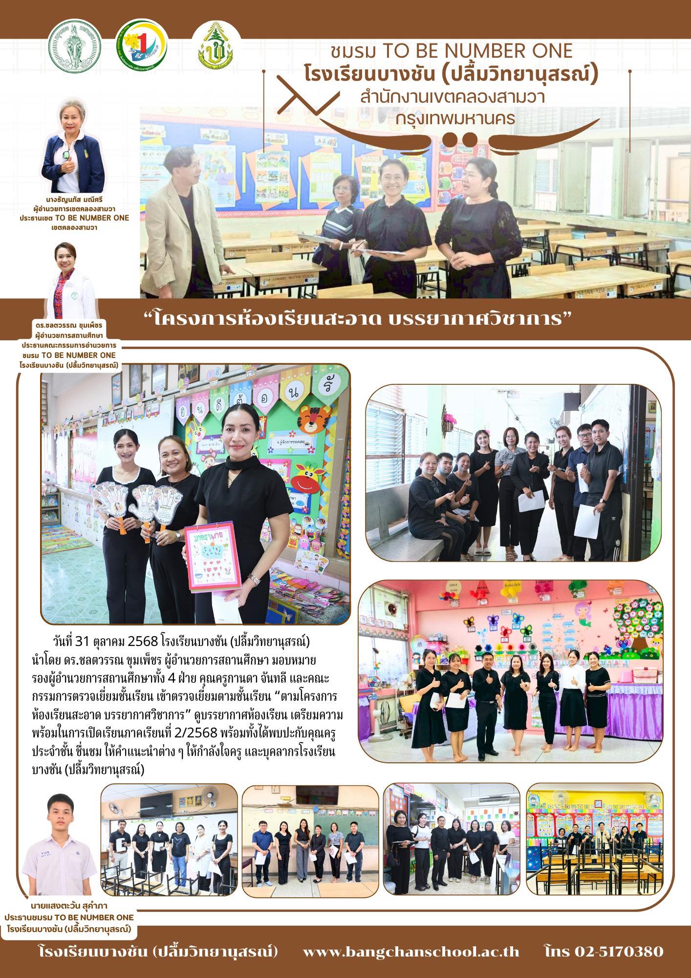 วันที่ 31 ตุลาคม 2568 โรงเรียนบางชัน (ปลื้มวิทยานุสรณ์) นำโดย ดร.ชลตวรรณ ขุมเพ็ชร ผู้อำนวยการสถานศึกษา มอบหมายรองผู้อำนวยการสถานศึกษาทั้ง 4 ฝ่าย คุณครูกานดา จันทลี และคณะกรรมการตรวจเยี่ยมชั้นเรียน เข้าตรวจเยี่ยมตามชั้นเรียน "โครงการ ห้องเรียนสะอาด บรรยากาศวิชาการ" ดูบรรยากาศห้องเรียน เตรียมความพร้อม...