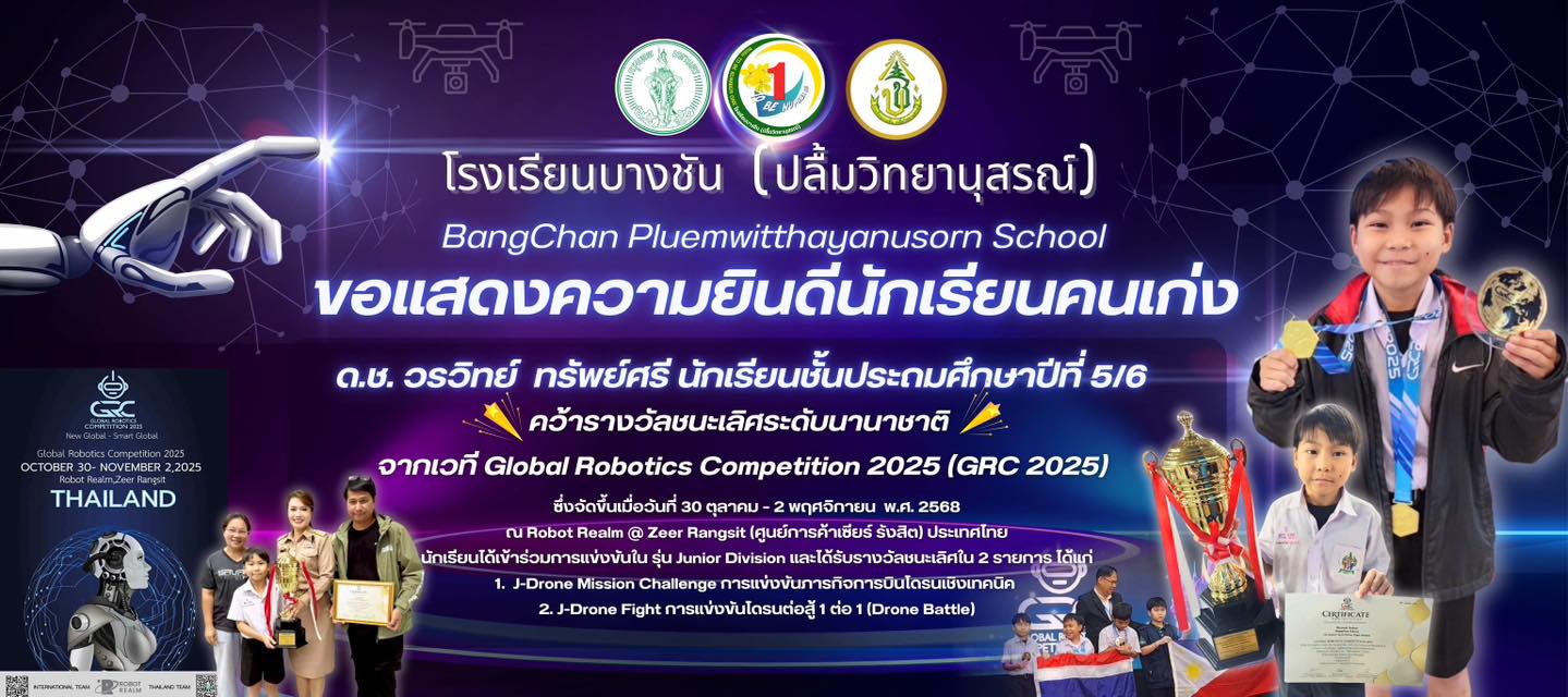 ขอแสดงความยินดีกับนักเรียนคนเก่งด.ช วรวิทย์ ทรัพย์ศรีคว้ารางวัลชนะเลิศ ระดับนานาชาติจากเวที Global Robotics Competition 2025 (GRC 2025)ซึ่งจัดขึ้นเมื่อวันที่ 30 ตุลาคม - 2 พฤศจิกายน พ.ศ. 2568 ณ Robot Realm @ Zeer Rangsit (ศูนย์การค้าเซียร์ รังสิต) ประเทศไทยนักเรียนได้เข้าร่วมการแข่งขันใน รุ่น Junior...