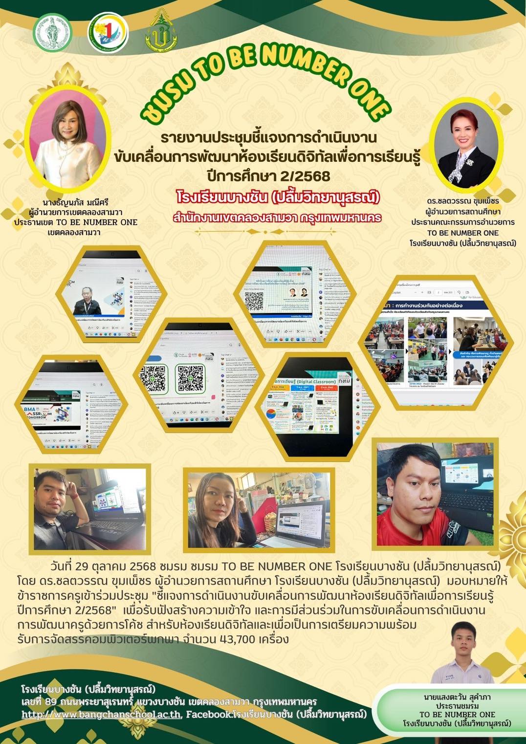 วันที่ 29 ตุลาคม 2568 ชมรม To Be Number One โรงเรียนบางชัน (ปลื้มวิทยานุสรณ์) นำโดย ดร.ชลตวรรณ ขุมเพ็ชร ผู้อำนวยการสถานศึกษาโรงเรียนบางชัน (ปลื้มวิทยานุสรณ์) มอบหมายให้ข้าราชการครูเข้าร่วม “ประชุมชี้แจงการดำเนินงานขับเคลื่อนการพัฒนาห้องเรียนดิจิทัล เพื่อการเรียนรู้ ปีการศึกษา 2/2568" เพื่อรับฟัง สร...