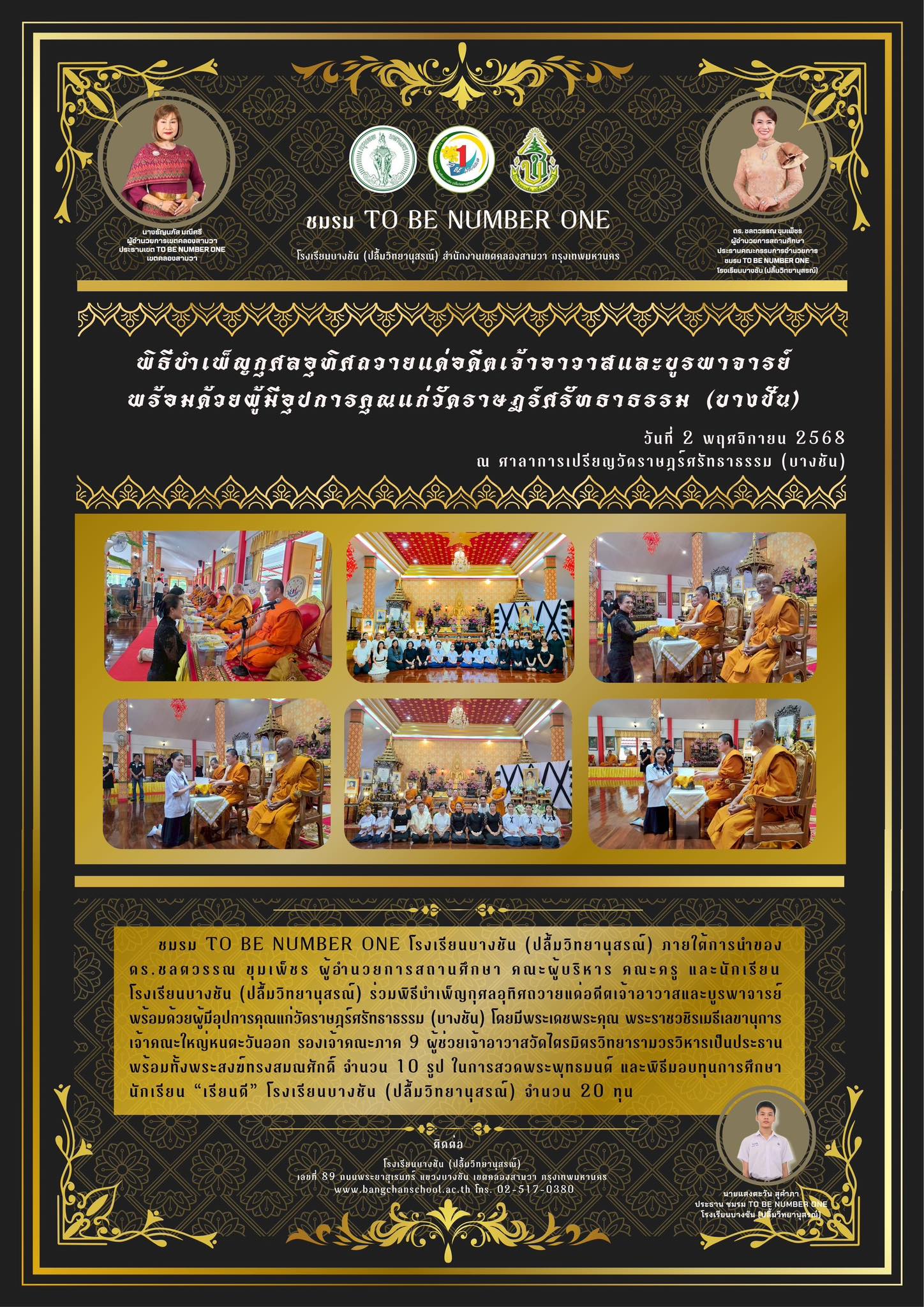 วันที่ 2 พฤศจิกายน 2568 ชมรม TO BE NUMBER ONE โรงเรียนบางชัน (ปลื้มวิทยานุสรณ์) ภายใต้การนำของดร.ชลตวรรณ ขุมเพ็ชร ผู้อำนวยการสถานศึกษา คณะผู้บริหาร คณะครู และนักเรียนโรงเรียนบางชัน (ปลื้มวิทยานุสรณ์) ร่วมพิธีบำเพ็ญกุศลอุทิศถวายแด่อดีตเจ้าอาวาสและบูรพาจารย์ พร้อมด้วยผู้มีอุปการคุณแก่วัดราษฎร์ศรัทธาธร...