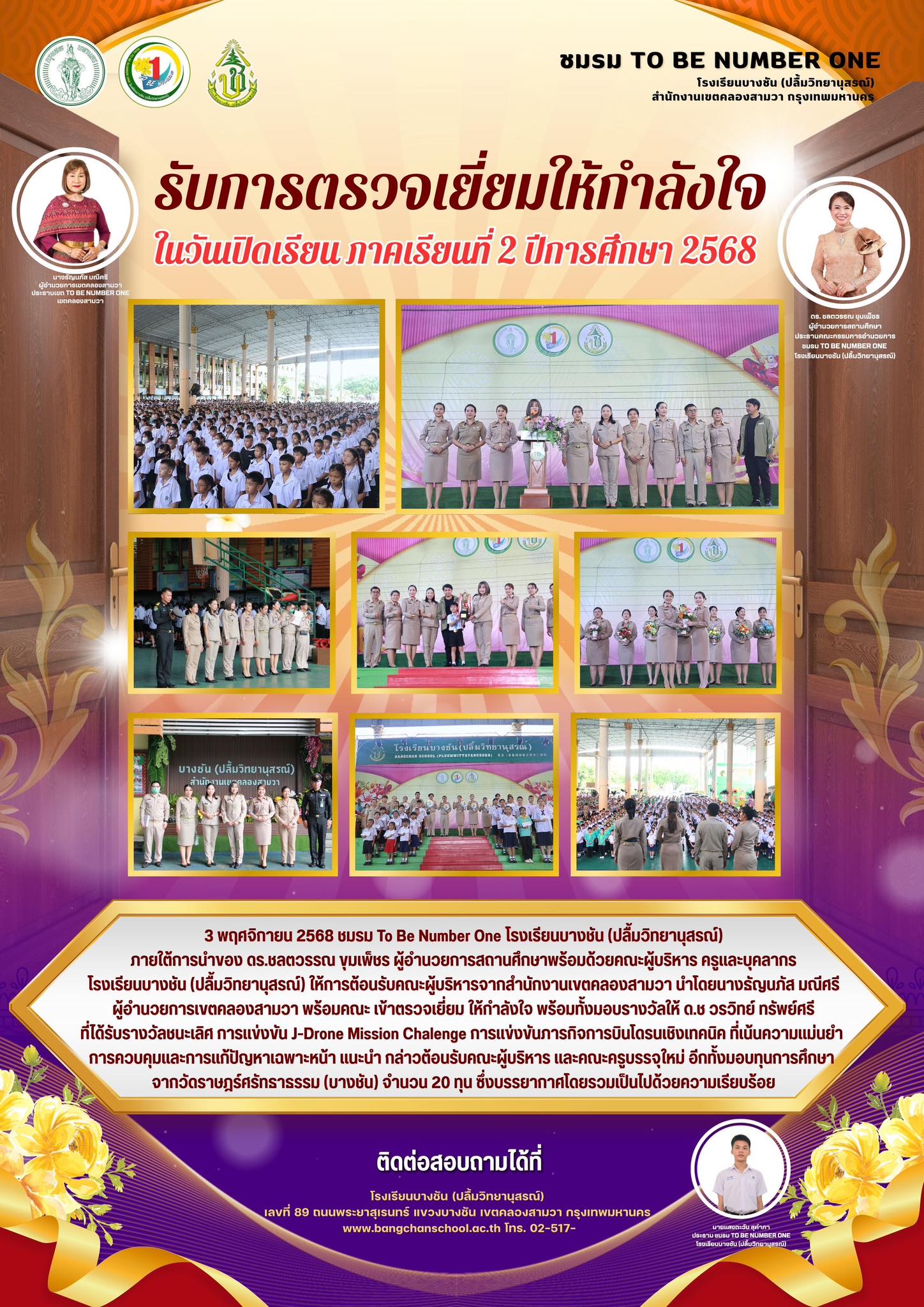 ชมรม To Be Number One โรงเรียนบางชัน (ปลื้มวิทยานุสรณ์) ภายใต้การนำของ ดร.ชลตวรรณ ขุมเพ็ชร ผู้อำนวยการสถานศึกษา พร้อมด้วยคณะผู้บริหาร ครูและบุคลากรโรงเรียนบางชัน (ปลื้มวิทยานุสรณ์) ให้การต้อนรับคณะผู้บริหารจากสำนักงานเขตคลองสามวา นำโดยนางธัญนภัส มณีศรี ผู้อำนวยการเขตคลองสามวา พร้อมคณะ เข้าตรวจเยี่ยม...