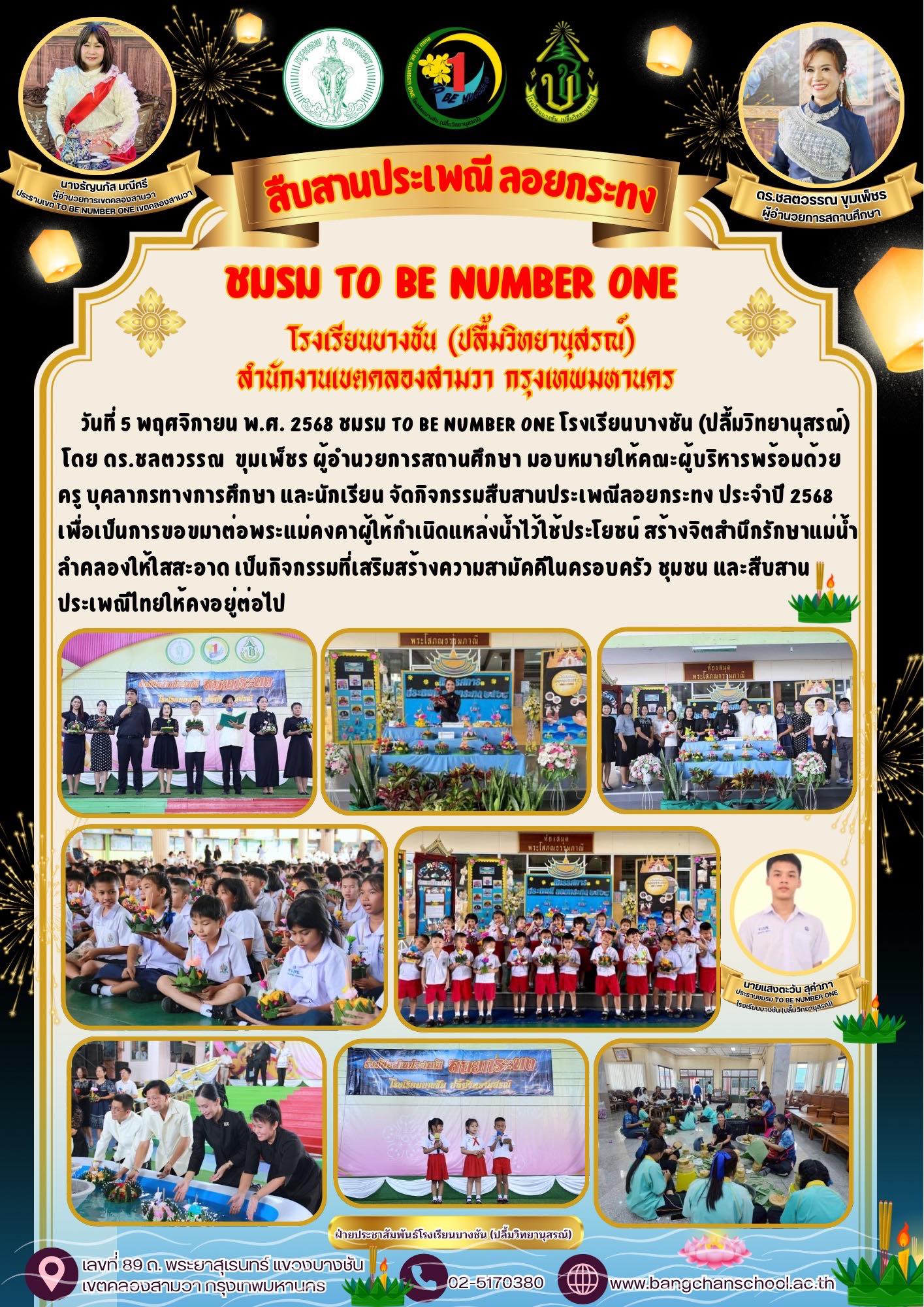 วันที่ 5 พฤศจิกายน พ.ศ. 2568 ชมรม TO BE NUMBER ONE โรงเรียนบางชัน (ปลื้มวิทยานุสรณ์)โดย ดร.ชลตวรรณ ขุมเพ็ชร ผู้อำนวยการสถานศึกษา มอบหมายให้คณะผู้บริหาร พร้อมด้วยครู บุคลากรทางการศึกษา และนักเรียน จัดกิจกรรมสืบสานประเพณีลอยกระทง ประจำปี 2568 เพื่อเป็นการขอขมาต่อพระแม่คงคาผู้ให้กำเนิดแหล่งน้ำไว้ใช้ประ...