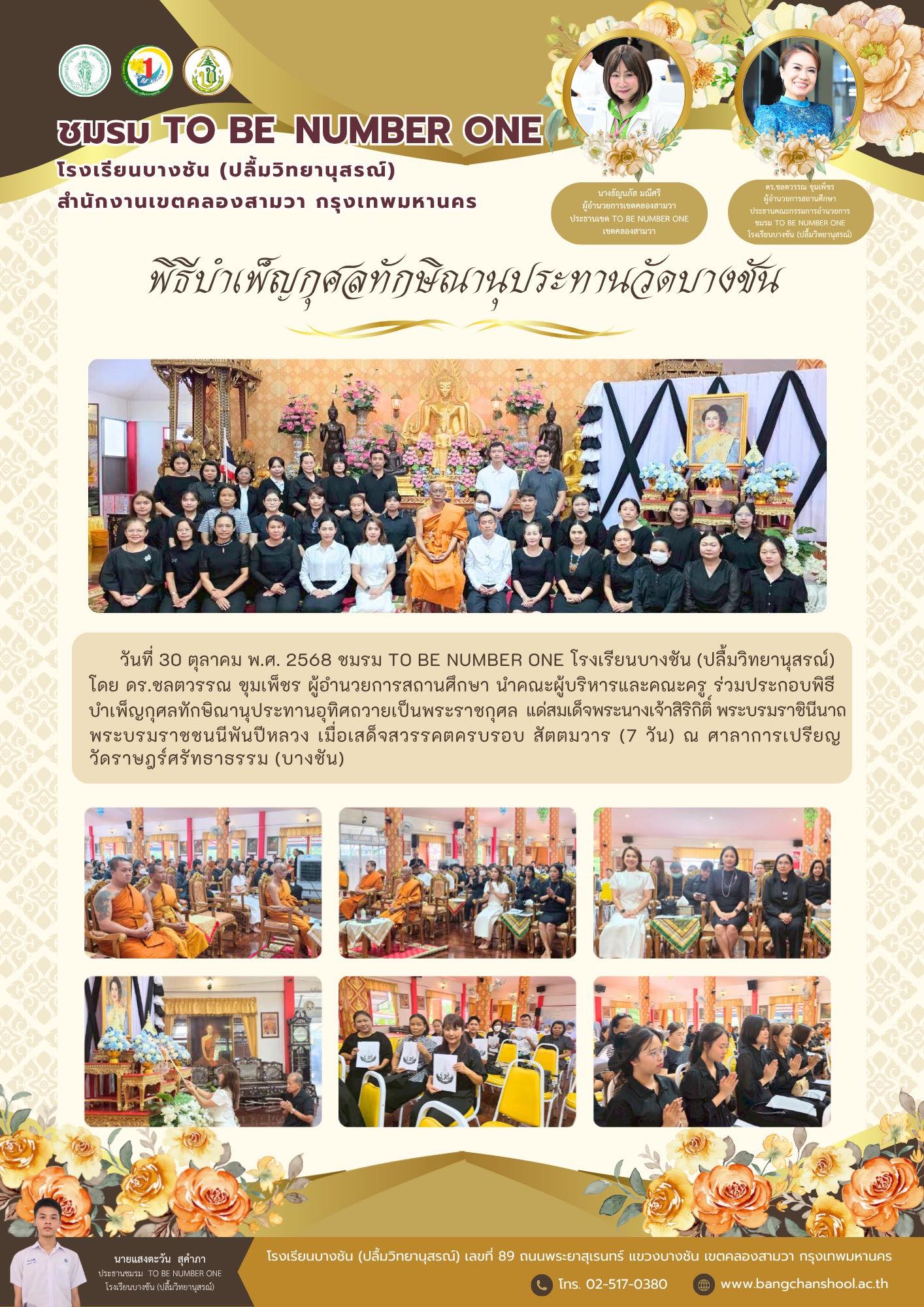 วันที่ 30 ตุลาคม พ.ศ. 2568 ชมรม TO BE NUMBER ONE โรงเรียนบางชัน (ปลื้มวิทยานุสรณ์) โดย ดร.ชลตวรรณ ขุมเพ็ชร ผู้อำนวยการสถานศึกษา นำคณะผู้บริหารและคณะครู ร่วมประกอบพิธีบำเพ็ญกุศลทักษิณานุประทานอุทิศถวายเป็นพระราชกุศล แด่สมเด็จพระนางเจ้าสิริกิติ์ พระบรมราชินีนาถ พระบรมราชชนนีพันปีหลวง เมื่อเสด็จสวรรคตค...