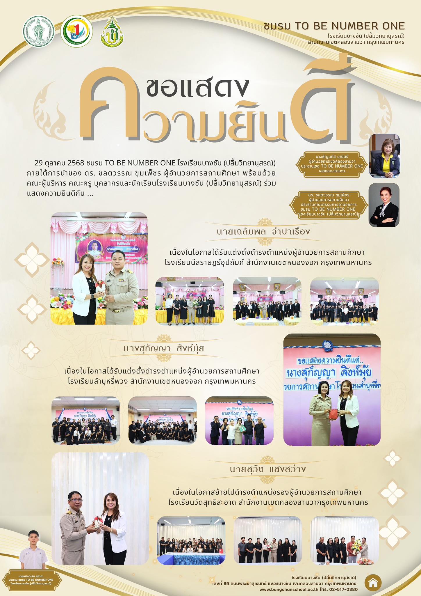 วันที่ 29 ตุลาคม 2568 ชมรม TO BE NUMBER ONE โรงเรียนบางชัน (ปลื้มวิทยานุสรณ์)ภายใต้การนำของ ดร.ชลตวรรณ ขุมเพ็ชร ผู้อำนวยการสถานศึกษา พร้อมด้วยคณะผู้บริหาร ครู บุคลากรและนักเรียนโรงเรียนบางชัน (ปลื้มวิทยานุสรณ์) ร่วมแสดงความยินดี กับนายเฉลิมพล จำปาเรือง เนื่องในโอกาสได้รับแต่งตั้งดำรงตำแหน่งผู้อำนวยก...