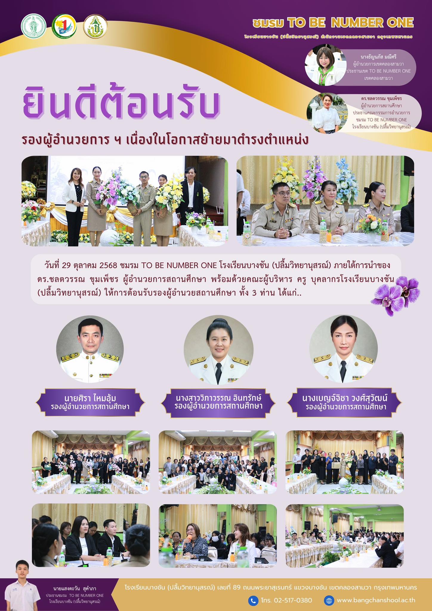 29 ตุลาคม 2568 ชมรม TO BE NUMBER ONE โรงเรียนบางชัน (ปลิ้มวิทยานุสรณ์) ภายใต้การนำของดร.ชลตวรรณ ขุมเพ็ชร ผู้อำนวยการสถานศึกษา พร้อมด้วยคณะผู้บริหาร ครู บุคลากรและนักเรียนโรงเรียนบางชัน (ปลื้มวิทยานุสรณ์)>>ให้การต้อนรับรองผู้อำนวยสถานศึกษา ทั้ง 3 ท่าน..นายศิรา ไหมอุ้มนางเบญจ์จิชา วงศ์สุวัฒน์นาง...