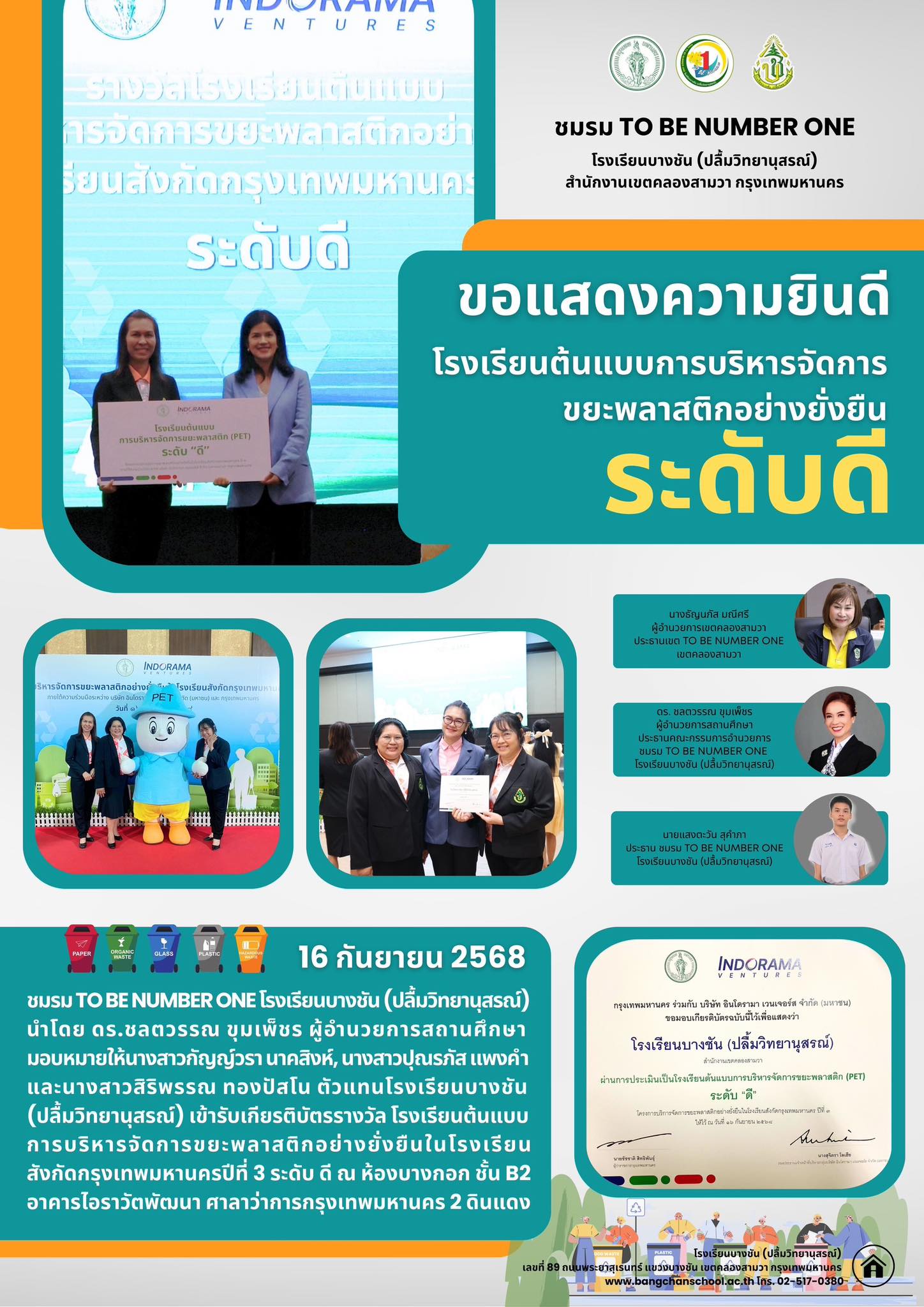 โรงเรียนต้นแบบการบริหารจัดการขยะพลาสติกอย่างยั่งยืนในโรงเรียนสังกัดกรุงเทพมหานครปีที่ 3“ระดับ ดี” >>>16 กันยายน 2568 ชมรม TO BE NUMBER ONE โรงเรียนบางชัน (ปลื้มวิทยานุสรณ์) นำโดย ดร.ชลตวรรณ ขุมเพ็ชร ผู้อำนวยการสถานศึกษา มอบหมายให้นางสาวกัญญ์วรา นาคสิงห์ นางสาวปุณรภัส แพงคำ และนางสาวสิร...