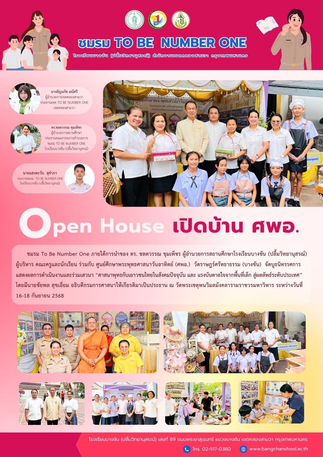 Open House เปิดบ้าน ศพอ.ชมรม To Be Number One ภายใต้การนำของ ดร.ชลตวรรณ ขุมเพ็ชร ผู้อำนวยการสถานศึกษาโรงเรียนบางชัน (ปลื้มวิทยานุสรณ์) ผู้บริหาร คณะครูและนักเรียน ร่วมกับศูนย์ศึกษาพระพุทธศาสนาวันอาทิตย์ (ศพอ.) วัดราษฎร์ศรัทธาธรรม (บางชัน) จัดบูธนิทรรศการแสดงผลการดำเนินงานและร่วมเสวนา "ศาสนาพุทธกับเย...