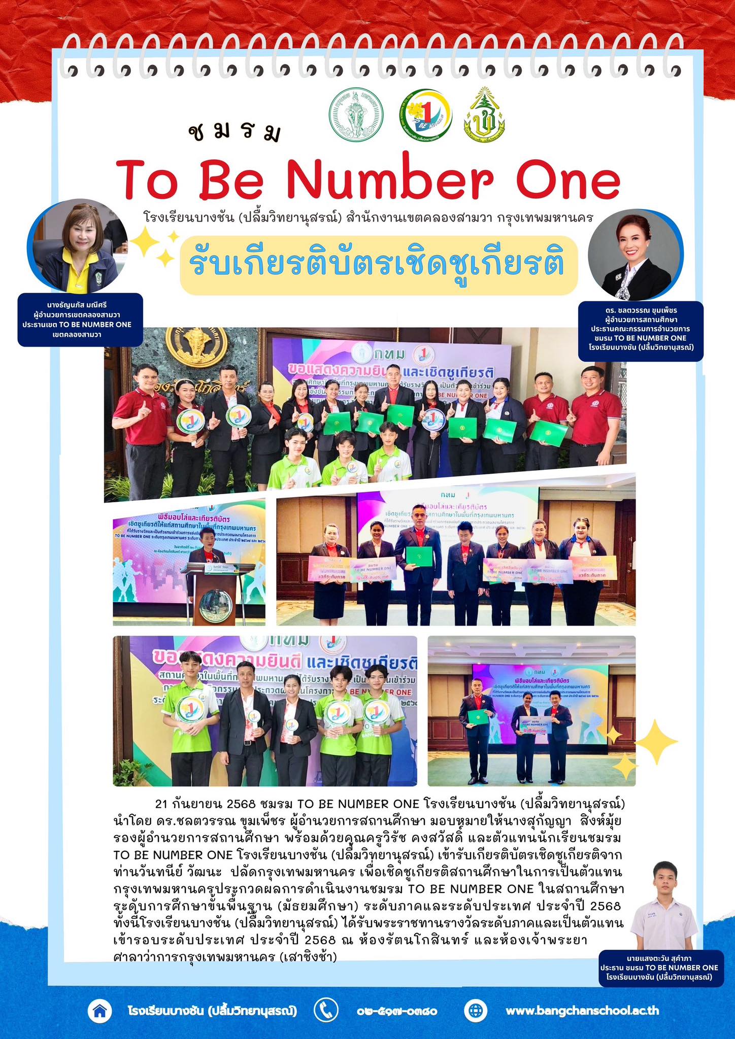 รับเกียรติบัตรเชิดชูเกียรติ***21 กันยายน 2568 ชมรม TO BE NUMBER ONE โรงเรียนบางชัน (ปลื้มวิทยานุสรณ์) นำโดย ดร.ชลตวรรณ ขุมเพ็ชร ผู้อำนวยการสถานศึกษา มอบหมายให้นางสุกัญญา สิงห์มุ้ย รองผู้อำนวยการสถานศึกษา พร้อมด้วยคุณครูวิรัช คงสวัสดิ์ และตัวแทนนักเรียนชมรม TO BE NUMBER ONE โรงเรียนบางชัน (ปลื้มวิทยา...