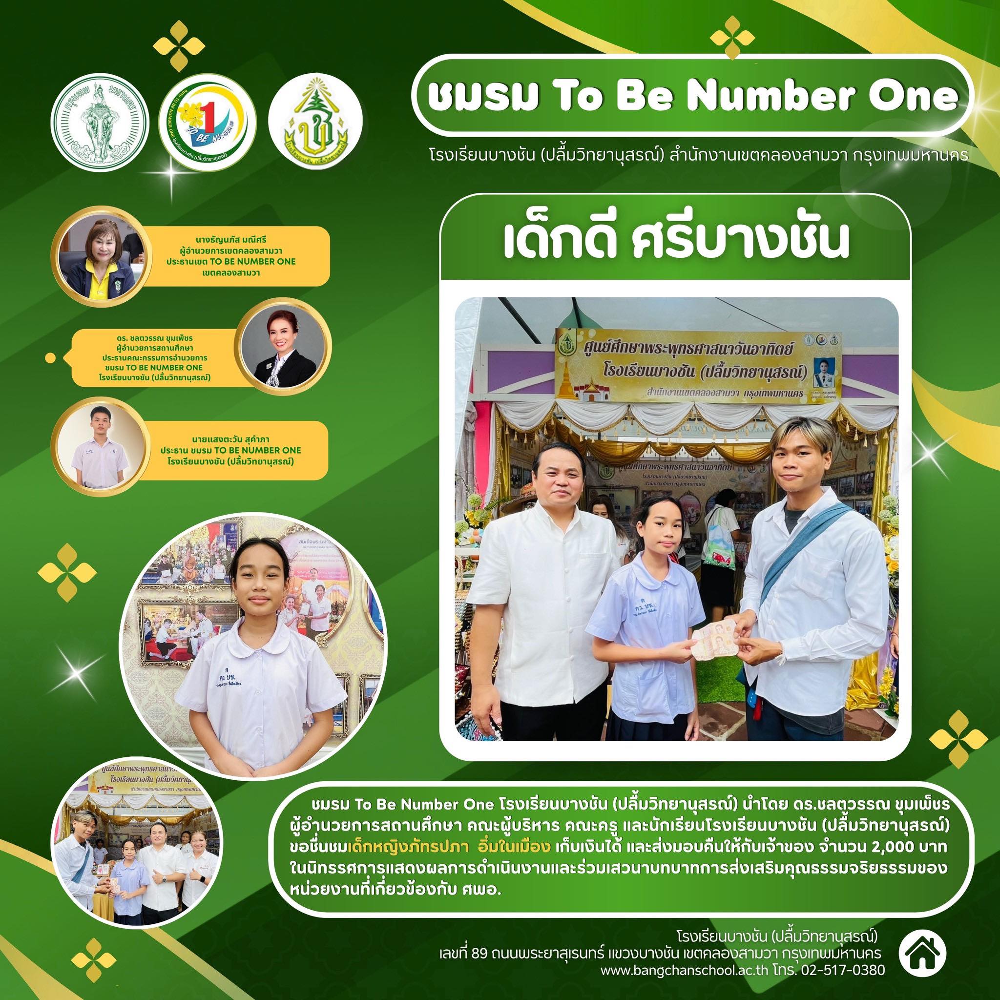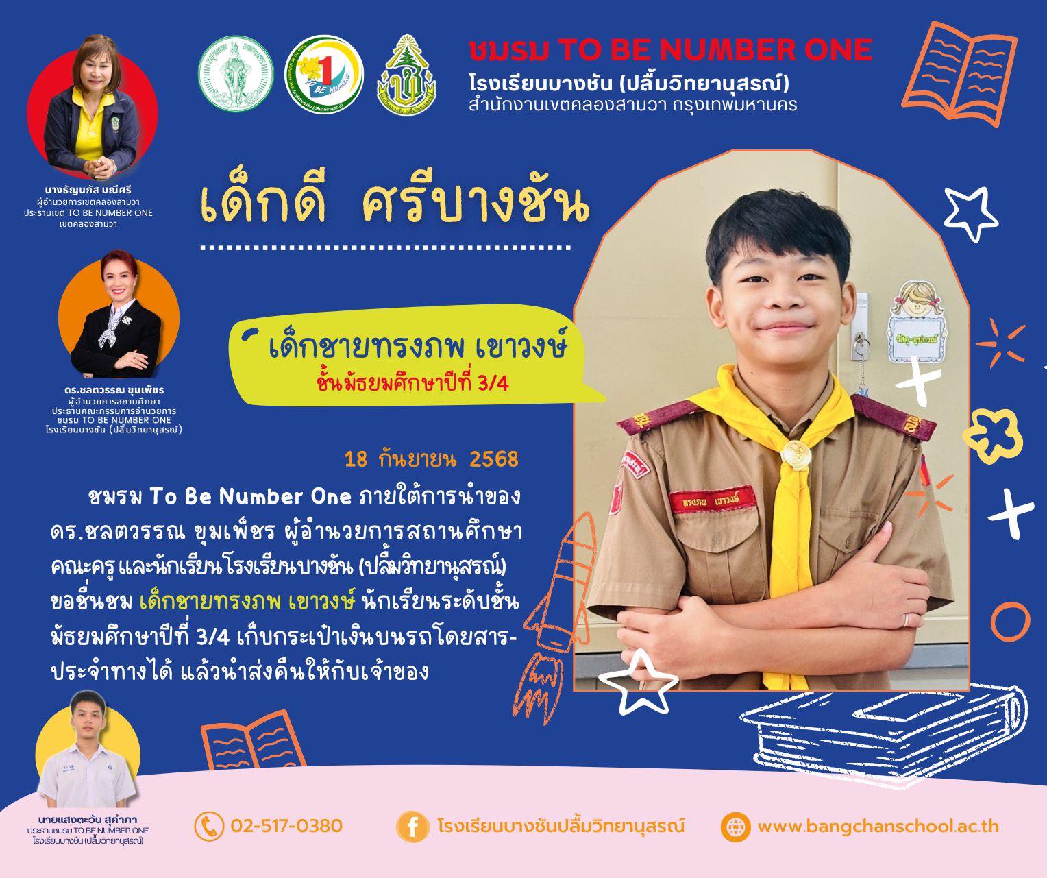 เด็กดี ศรีบางชัน****18 กันยายน 2568 ชมรม To Be Number One ภายใต้การนำของ ดร.ชลตวรรณ ขุมเพ็ชร ผู้อำนวยการสถานศึกษา คณะครู และนักเรียนโรงเรียนบางชัน (ปลื้มวิทยานุสรณ์) ขอชื่นชม เด็กชายทรงภพ เขาวงษ์ นักเรียนระดับชั้นมัธยมศึกษาปีที่ 3/4 เก็บกระเป๋าเงินบนรถโดยสารประจำทางได้ แล้วนำส่งคืนให้กับเจ...