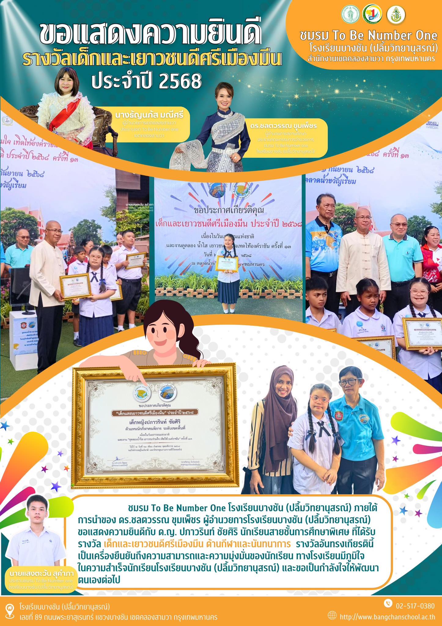 ขอแสดงความยินดี “รางวัลเด็กและเยาวชนดีศรีเมืองมีน“ ประจำปี 2568***ชมรม To Be Number One โรงเรียนบางชัน (ปลื้มวิทยานุสรณ์) ภายใต้การนำของ ดร.ชลตวรรณ ขุมเพ็ชร ผู้อำนวยการโรงเรียนบางชัน (ปลื้มวิทยานุสรณ์) ขอแสดงความยินดีกับ ด.ญ.ปภาวรินท์ ชัยศิริ นักเรียนสายชั้นการศึกษาพิเศษ ที่ได้รับรางวัล “เด็กและเยาว...