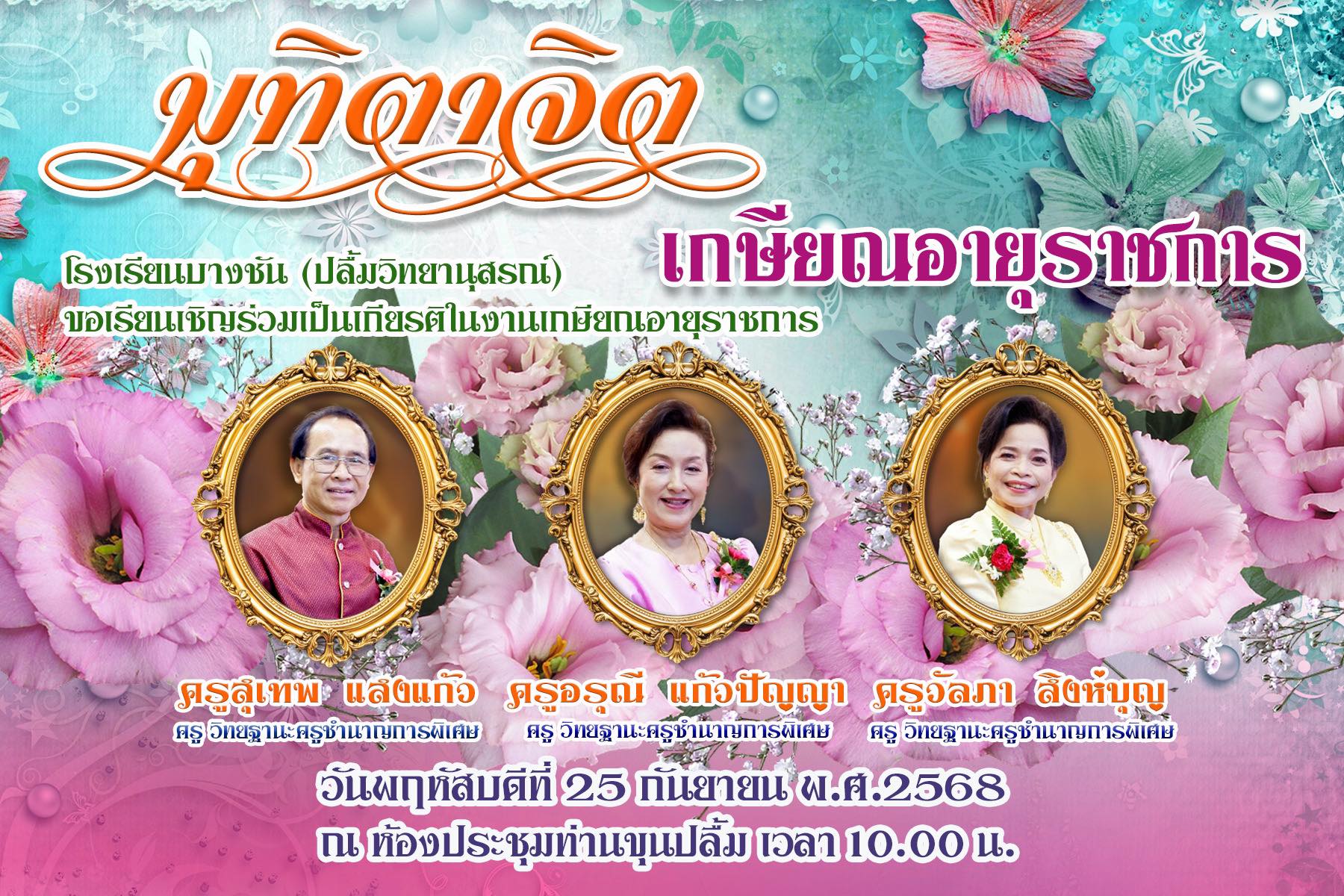 มุทิตาจิตเกษียณอายุราชการ ประจำปี 2568คุณครูสุเทพ แสงแก้ว คุณครูอรุณี แก้วปัญญา คุณครูวัลภา สิงห์บุญวันพฤหัสบดีที่ 25 กันยายน พ.ศ.2568ณ ห้องประชุมท่านขุนปลื้ม โรงเรียนบางชัน (ปลื้มวิทยานุสรณ์)
