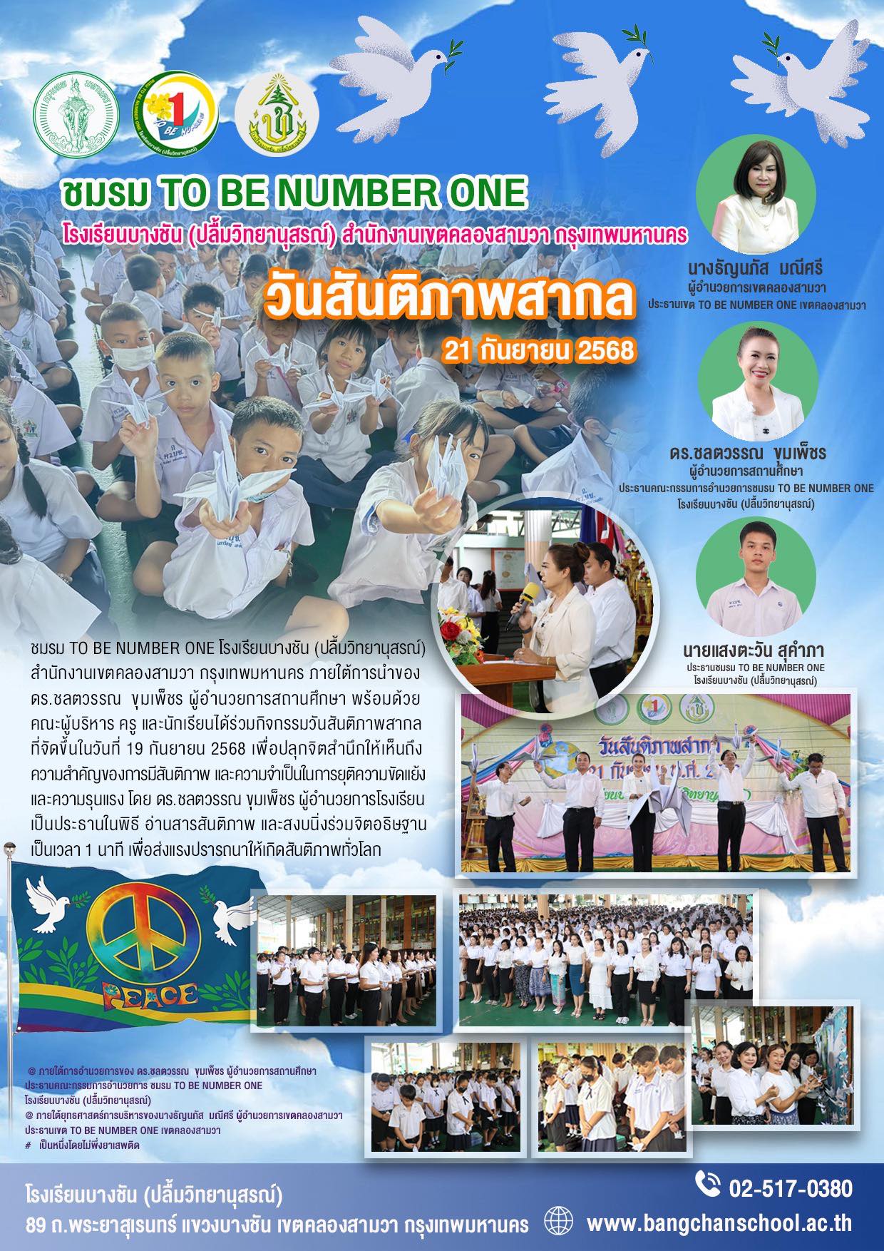 วันสันติภาพสากล 21 กันยายนของทุกปี****ชมรม TO BE NUMBER ONE โรงเรียนบางชัน (ปลื้มวิทยานุสรณ์) สำนักงานเขตคลองสามวากรุงเทพมหานคร ภายใต้การนำของดร.ชลตวรรณ ขุมเพ็ชร ผู้อำนวยการสถานศึกษา พร้อมด้วยคณะผู้บริหาร ครู และนักเรียนได้ร่วมกิจกรรมวันสันติภาพสากล ที่จัดขึ้นในวันที่ 19 กันยายน 2568 เพื่อปลุกจิตสำน...
