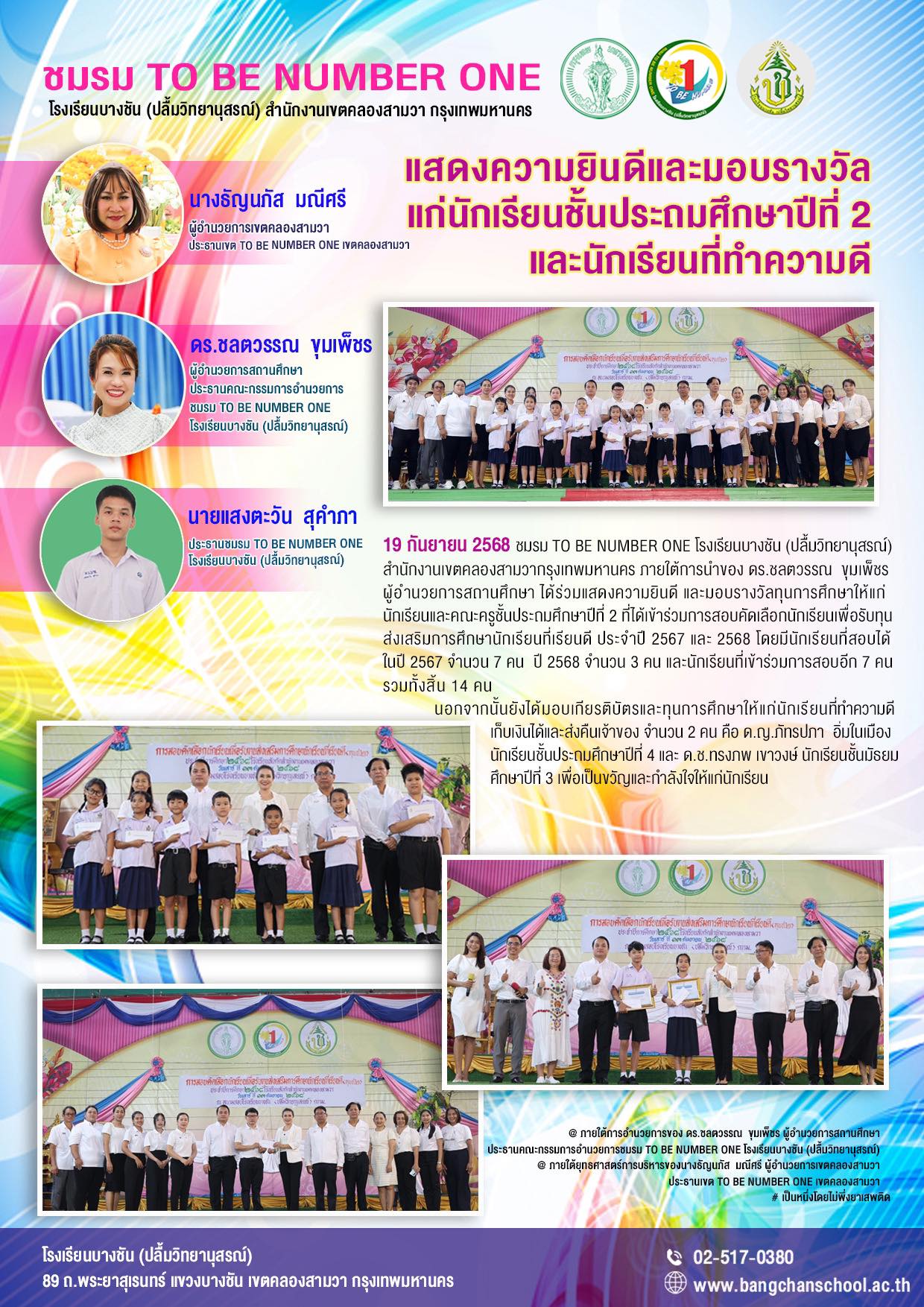 แสดงความยินดีและมอบรางวัลแก่นักเรียนชั้นประถมศึกษาปีที่ 2 และนักเรียนที่ทำความดี***19 กันยายน 2568 ชมรม TO BE NUMBER ONE โรงเรียนบางชัน (ปลื้มวิทยานุสรณ์) สำนักงานเขตคลองสามวา กรุงเทพมหานคร ภายใต้การนำของ ดร.ชลตวรรณ ขุมเพ็ชร ผู้อำนวยการสถานศึกษา ได้ร่วมแสดงความยินดี และมอบรางวัลทุนการศึกษาให้แก่นักเ...